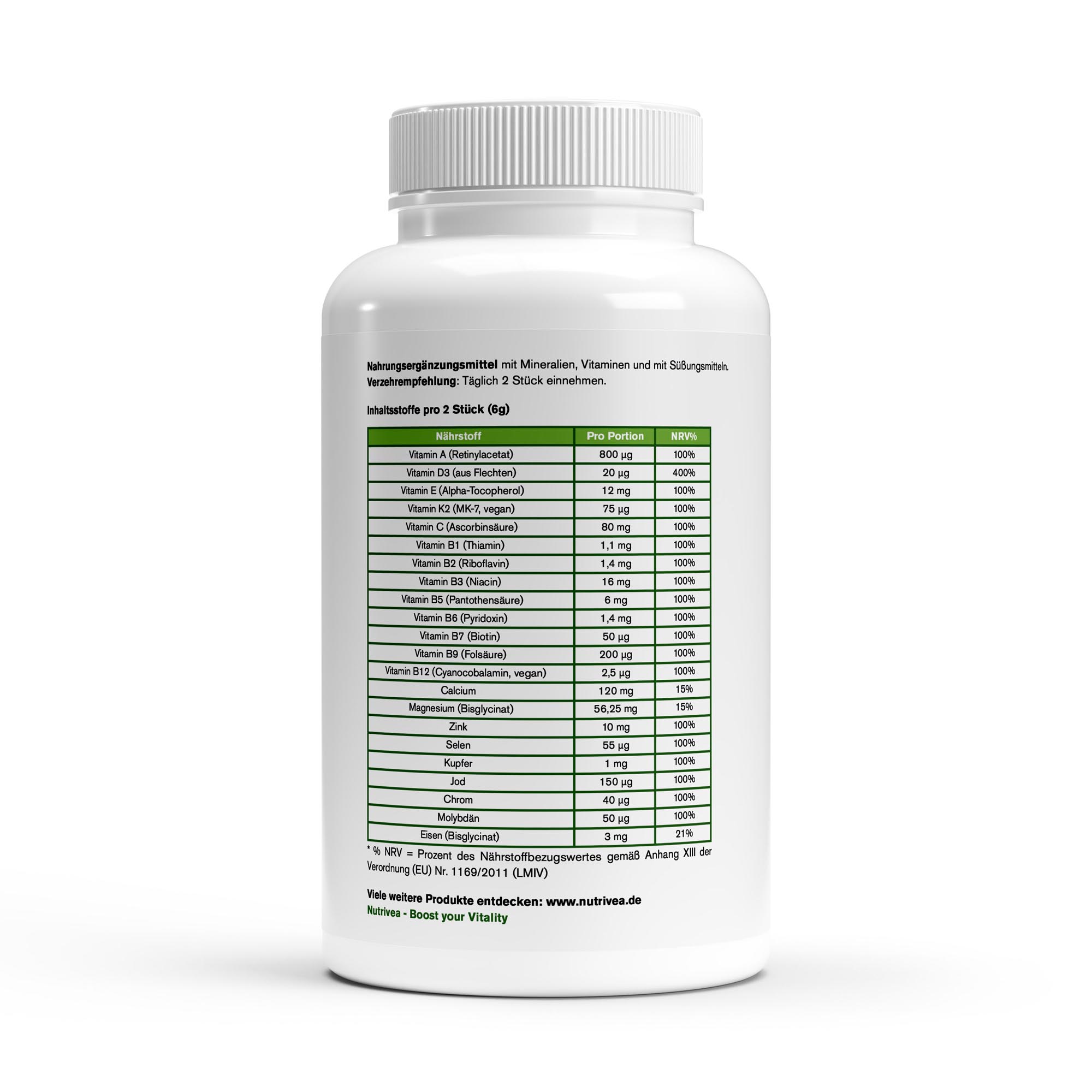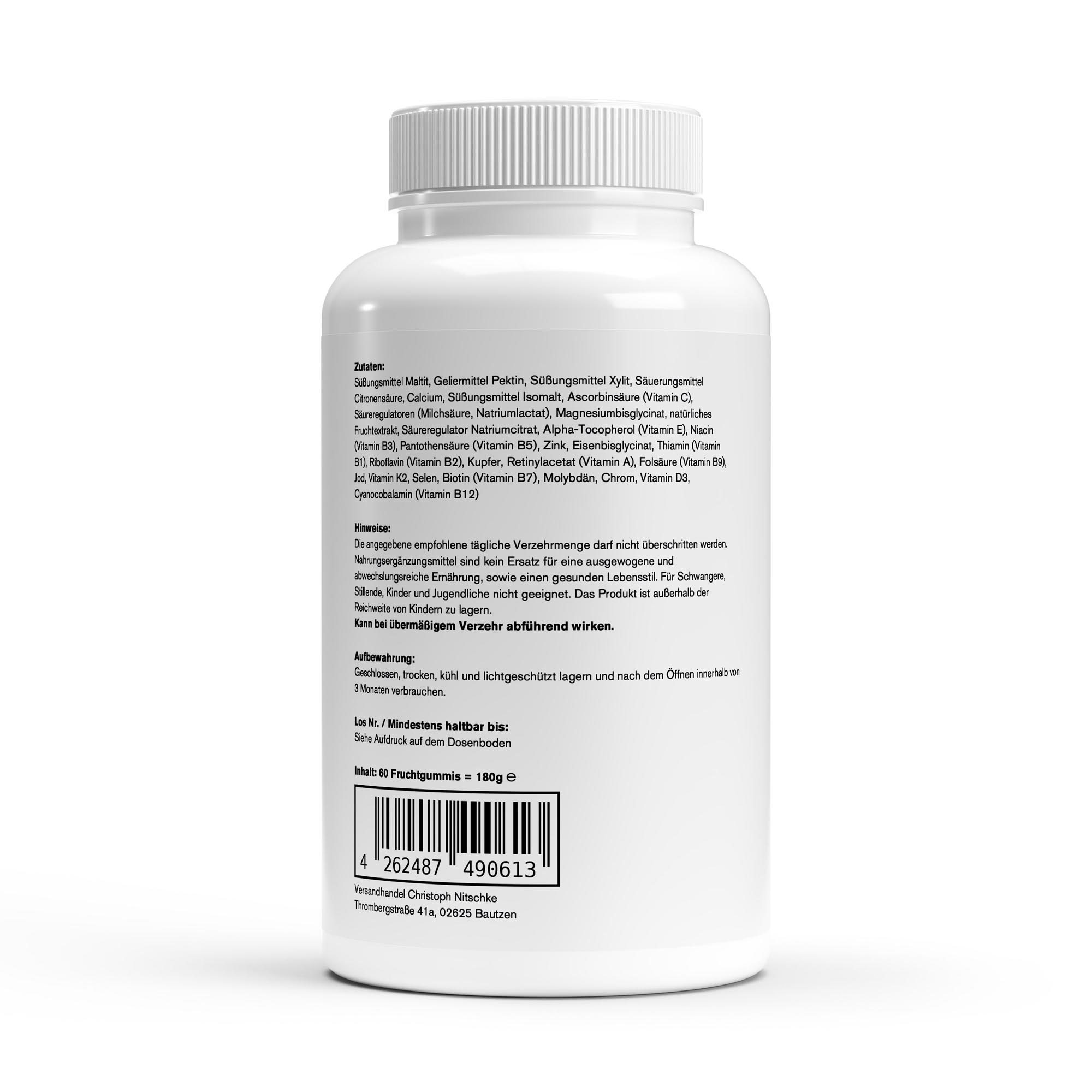Unsere Multivitamin + Mineral-Fruchtgummis enthalten sorgfältig ausgewählte Vitamine und Mineralstoffe. Die Rezeptur ist ohne Zuckerzusatz und für eine vegane Ernährung geeignet. In jeder Dose befinden sich 60 Stück; die empfohlene Tagesportion beträgt 2 Stück.